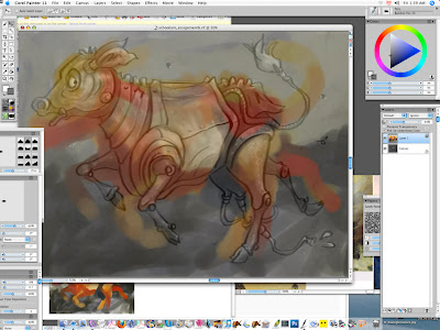 Here I've started using my prof Ryan Wood's custom "washabrusha" painting brush to paint in the background colors and starting the cow. Just choosing the colors on the color circle at the upper right, and painting directly onto the canvas.