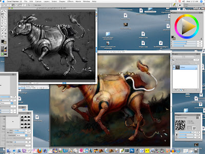 Well, here is a rather detailed step by step of finishing up my painting of an escaped robotic dairy cow from Schoolism Painting in Painter (11) with Ryan Wood, Assignment 6. (Click on any image to see larger) Assignment 3 was to draw a black and white "shiny" (ie hard reflective surfaces) character. Here is my submission: